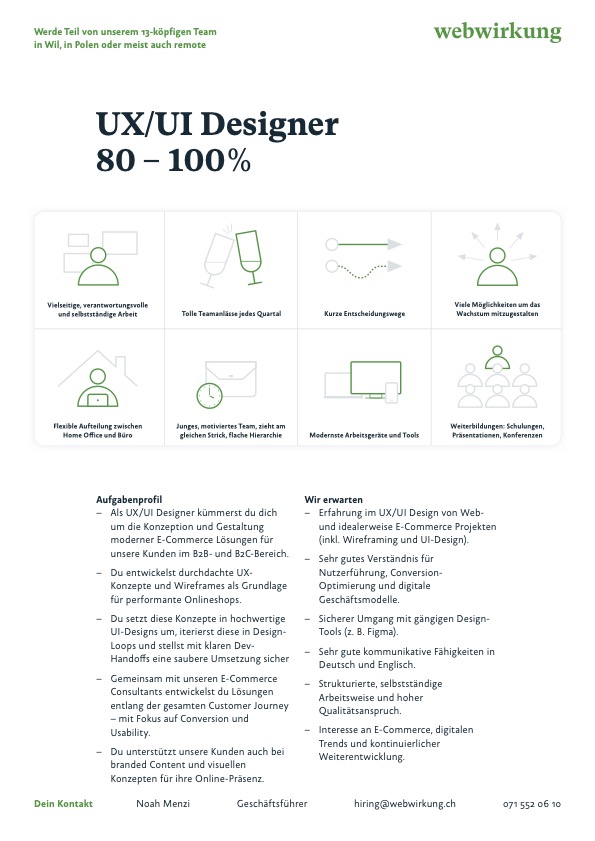 Egal wie du dich bewirbst, via LinkedIn oder direkt an hiring@webwirkung.ch, wir versuchen innerhalb von zwei Arbeitstagen zu bestätigen, dass wir deine Bewerbung erhalten haben. In drei Gesprächen finden wir heraus, ob wir zueinander passen.